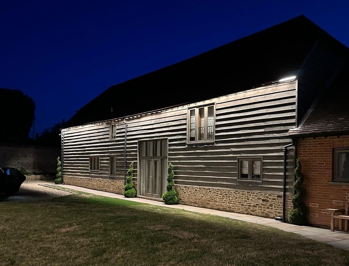 Due to the barns listed status we were not able to install any wall mounted outdoor lighting so instead we hid 20 meters of led strip behind the high barns gutter which elegantly illuminates the barns external facade at night.